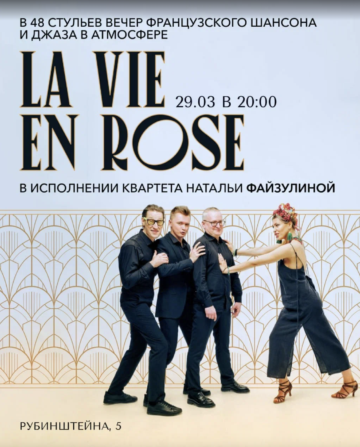 29 марта 2026 года в ресторане «48 Стульев» пройдет вечер французского джаза и шансона в атмосфере «La vie en rose» — «жизнь в розовом цвете».